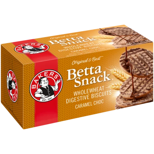 Betta Snack Caramel Choc Flavoured Biscuits is a whole grain snack that is easy to digest and good for your stomach. It is also sweet, fresh, and c...